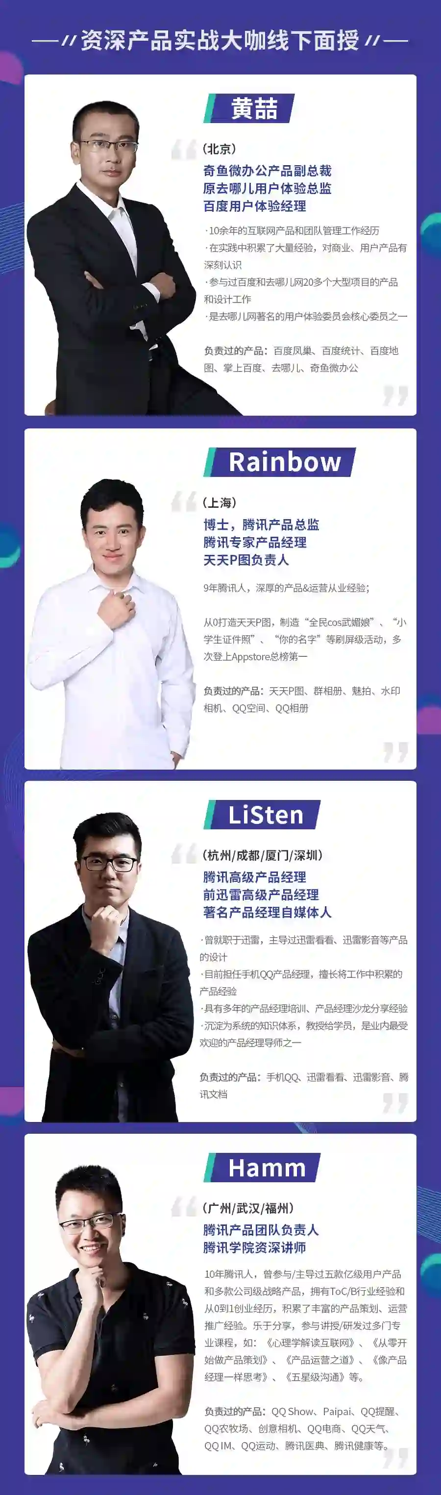 比如我当时参加课程的导师:天天P图负责人Rainbow老师,已经是腾讯产品总监段位。