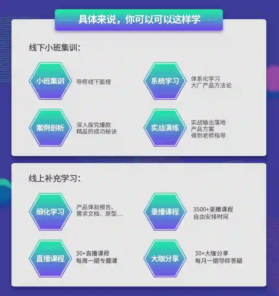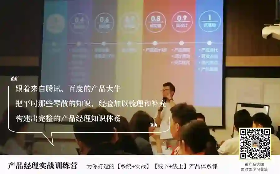 因为线下的课程,就是跟着腾讯、百度的产品大牛,通过系统+实战学习如何从0到1做一款产品,基于需求去分析、规划、设计……