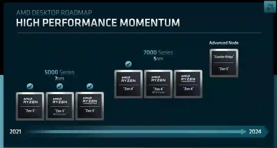 AMD 在今年的金融分析日上展示了未来几年的 CPU 计划,将在今年晚些时候发布 Zen 4 架构处理器,采用台积电 5nm 工艺,IPC 比 Zen 3 提高 8%,每瓦性能提高 8%-10%,整体性能提高 35%。AMD 还确认,将在 2024 年前推出 Zen 5 架构,采用台积电 4nm / 3nm 工艺,并将从头开始构建。显卡方面,AMD RDNA 3 架构显卡将在 2023 年推出,5nm 工艺,每瓦性能比现有 RDNA 2 产品提升 50% 以上。