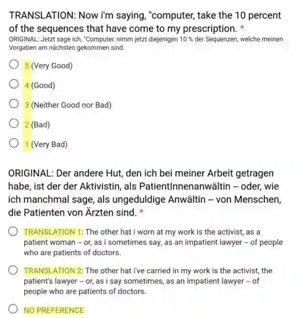 不同于普遍接受的看法,在 Kreutzer 等人 2018 年的工作中,他们发现 5 分制评分的评分者信度(Krippendorff’s α=0.51)要高于成对判断(α=0.39)。他们通过对每个评分者的基本判断进行标准化,消除个人偏见的可能性,从而解释这一点,并且过滤掉了评分者信度较低的评分者。成对判断主要的问题是差不多好或者差不多差的翻译结果之间的区别(较小),我们可以将这样的翻译结果过滤掉,从而提高评分者信度,最终得到上文所述的评分者信度。