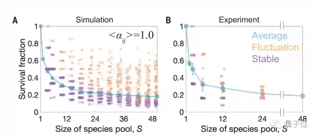 实验结果显示,群落生物量的波动在物种规模或者相互作用强度增加下,也会同样增加。以48个物种群落为例,研究人员发现只有在低营养浓度下才会达到稳定。
