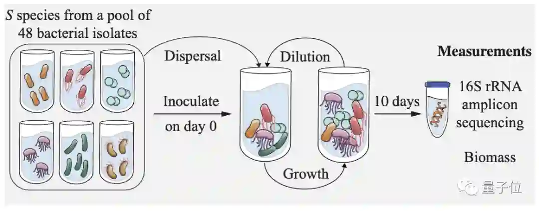具体而言,他们在实验室合成了2到48种细菌的生态系统,监测群落在生长、分散和稀释周期中群落的组成和生物量。