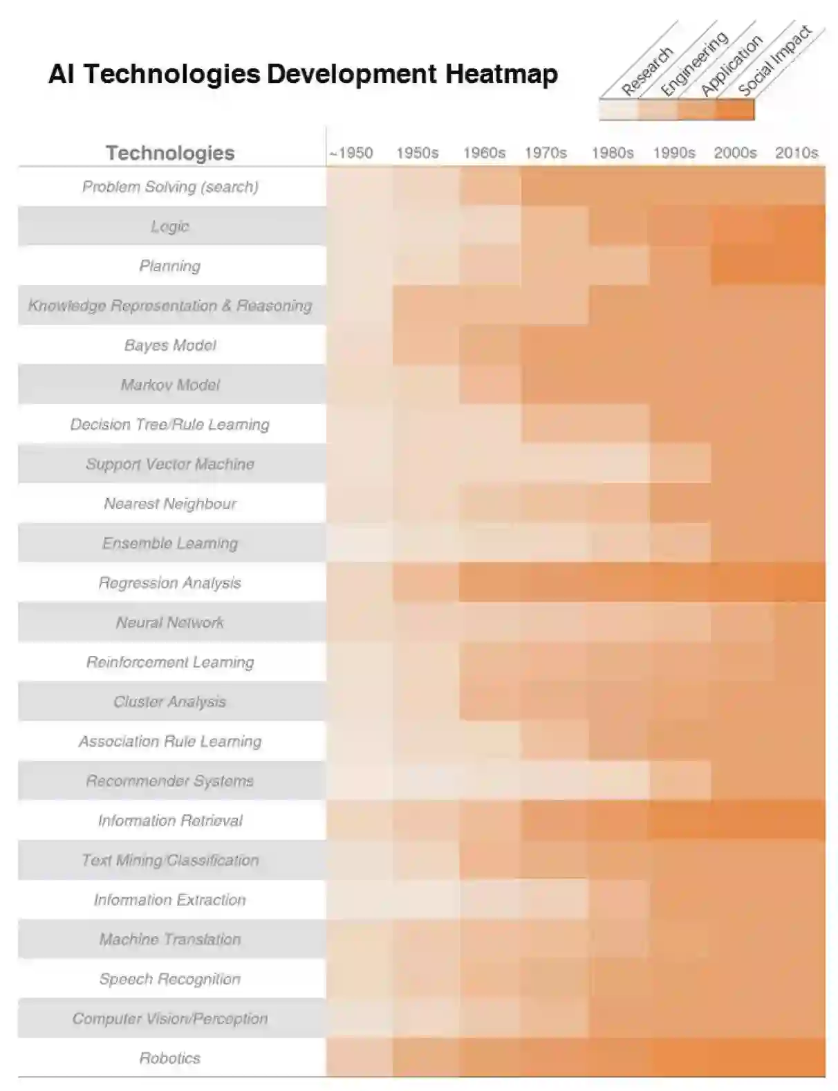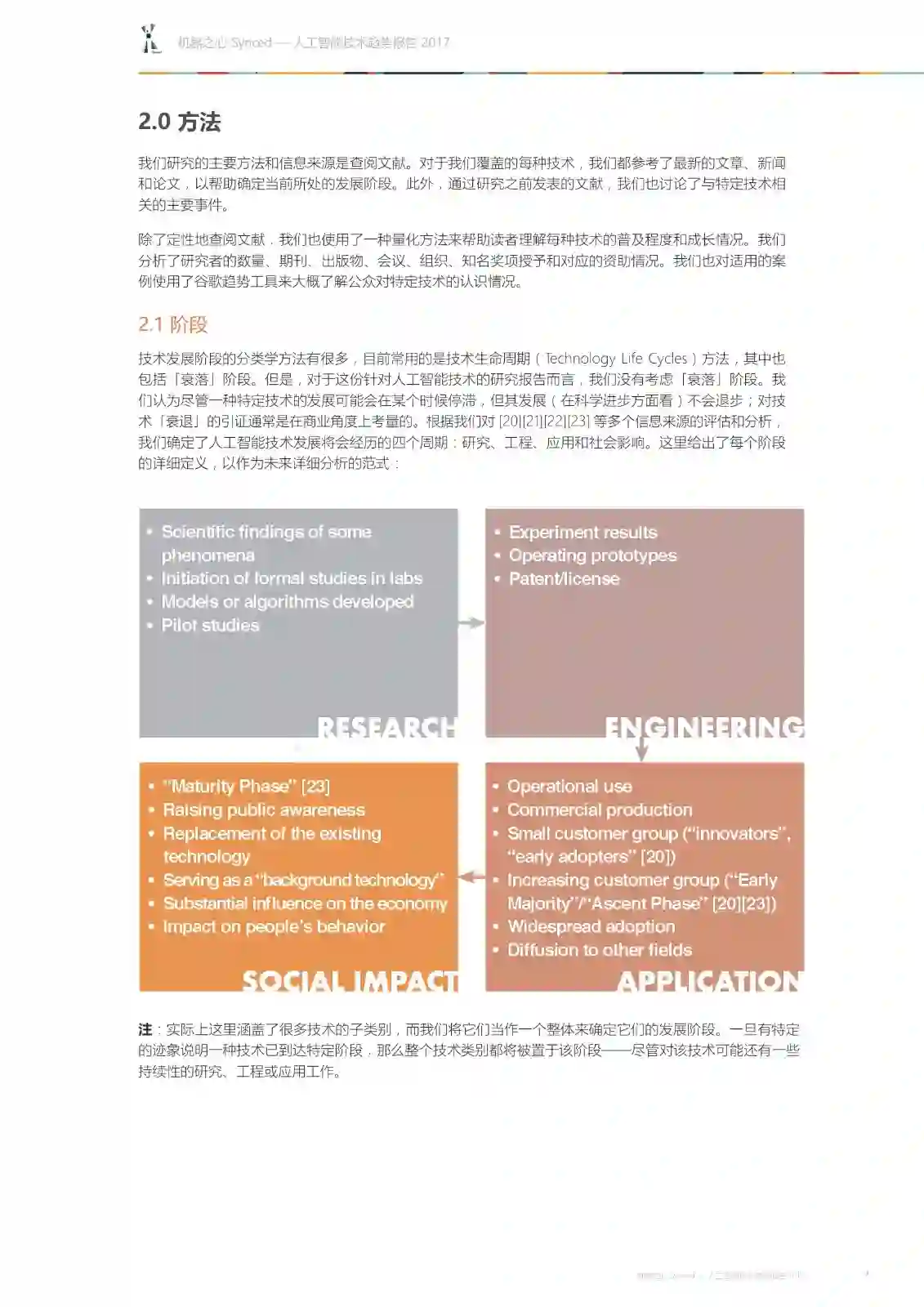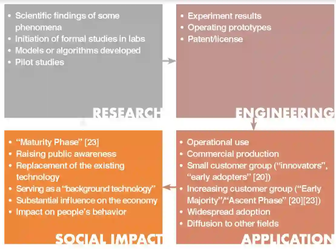 技术发展阶段的分类方法有很多。现有的大多数方法都被称为「技术生命周期(Technology Life Cycles)」,其中也包括「衰落」阶段。但是,对于这份针对人工智能技术的特定研究报告而言,我们没有考虑「衰落」阶段。尽管我们认为一种特定技术的发展可能会在某个时候停滞,但其发展(在科学进步方面看)不会退步;对技术「衰退」的引证通常是在商业角度上考量的。根据我们对多个信息来源的评估和分析,我们确定了人工智能技术发展将会经历的四个周期:研究、工程、应用和社会影响。这里给出了每个阶段的详细定义,以作为未来详细分析的范式: