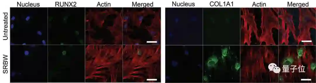 下图为第3天的结果,用荧光图像呈现,其中第一行为对照组,第二行为实验组,绿色代表RUNX2和COL1A1的表达。
