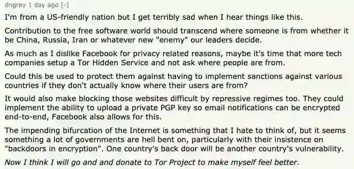 尽管出于隐私问题的原因,我不喜欢 Facebook,但或许是时候让更多的科技公司设立Tor 隐藏服务,别问用户来自哪里。