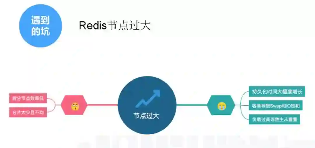 第一是拆分节点的效率较低,远远慢于公司业务量的增长。此外,分片太少。我们的分片是500个,codis是1024,codis原生是16384个,分片太少也是个问题。如果做自研的分布式方案,大家一定要把分片数量,稍微设大一点,避免业务发展超过你预期的情况。节点过大之后,会导致持久化的时间增长。我们30G的节点要持久化,主机剩余内存要大于30G,如果没有,你用Swap导致主机持久化时间大幅增长。一个30G的节点持久化可能要4个小时。负载过高也会导致主从重置,引起连锁反应。