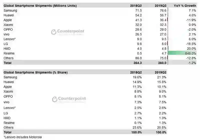 Counterpoint数据显示,2019年第二季度全球智能手机出货量为3.6亿台,同比下降1.2%,其中三星(7660万台)、华为(5670万台)、苹果(3640万台)、小米(3230万台)、OPPO(2970万台)、vivo(2700万台)排名出货量前六,此外,realme以470万台的出货量跻身全球出货量前十。