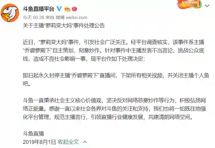 斗鱼直播平台通过官方微博发布关于主播“萝莉变大妈”事件处理公告称,经平台调查核实,该事件系主播“乔碧萝殿下”自主策划、刻意炒作。即日起永久封停主播“乔碧萝殿下”直播间,下架所有相关视频,并关闭主播个人鱼吧。
