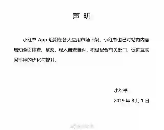 【小红书官方确认App下架,已全面启动内容整改】8月1日凌晨,小红书公司就App在各大应用市场下架一事在官方微博发表声明,声明称小红书已对站内内容启动全面排查、整改,深入自查自纠,积极配合有关部门,促进互联网环境的优化与提升。