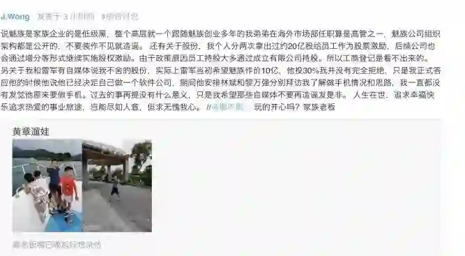 魅族科技创始人、魅族集团董事长兼CEO黄章在魅族社区中表示,“关于我和雷军有自媒体说我不舍得股份,实际上雷军当初希望魅族作价10亿,他投30%我并没有完全拒绝,只是我正式答应他的时候他说他已经决定自己做一个软件公司,期间他安排林斌和黎万强分别拜访我了解做手机情况和思路,我一直都没有发觉他原来要做手机。”(三言财经)