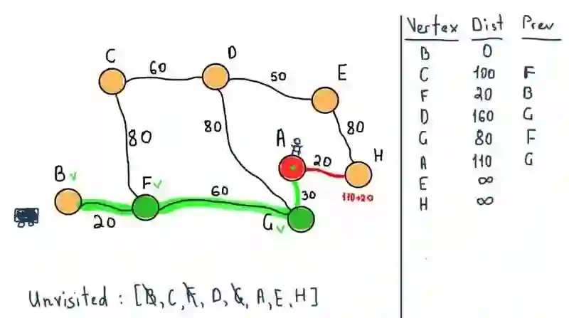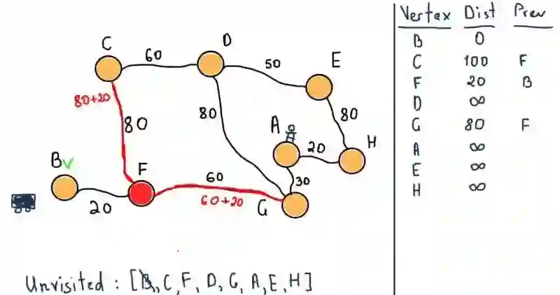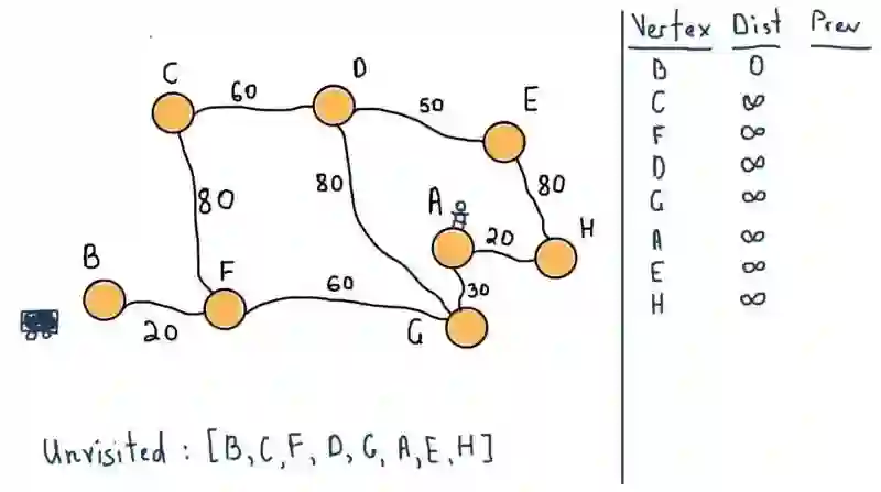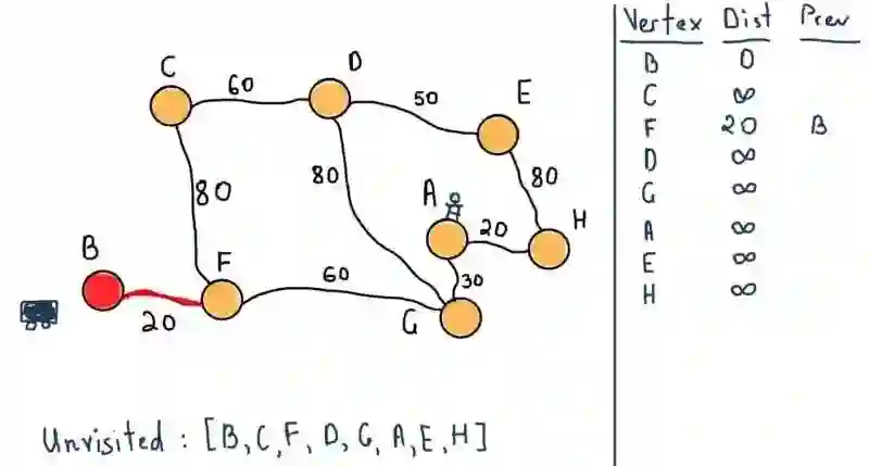 所有的节点都属于未访问集合,需要注意图示右侧的表格。对于所有节点,它将包含从B到前一个(标记为“Prev”)节点的所有最短距离。例如,从B到F的距离是20,前一个节点是B。