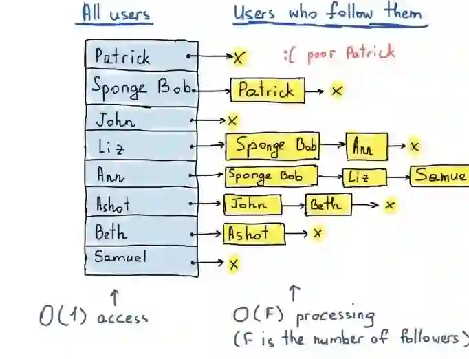 与Facebook的例子相对,如果Alice在Twitter上关注Bob,那不需要Bob回粉Alice。所以一个“关注”关系必须有一个方向来指示是谁关注谁,图表示中就是哪个节点(用户)有一个有向边(关注)到另一个节点。