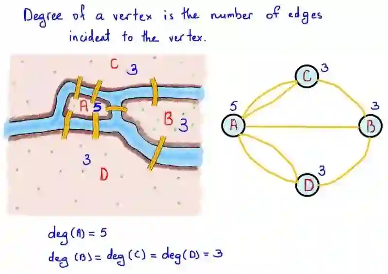 下一个重要的概念就是所谓的节点自由度,即入射(连接)到节点的边的数量。在上面的例子中,与陆地连结的桥的数目可以视为图的节点自由度。