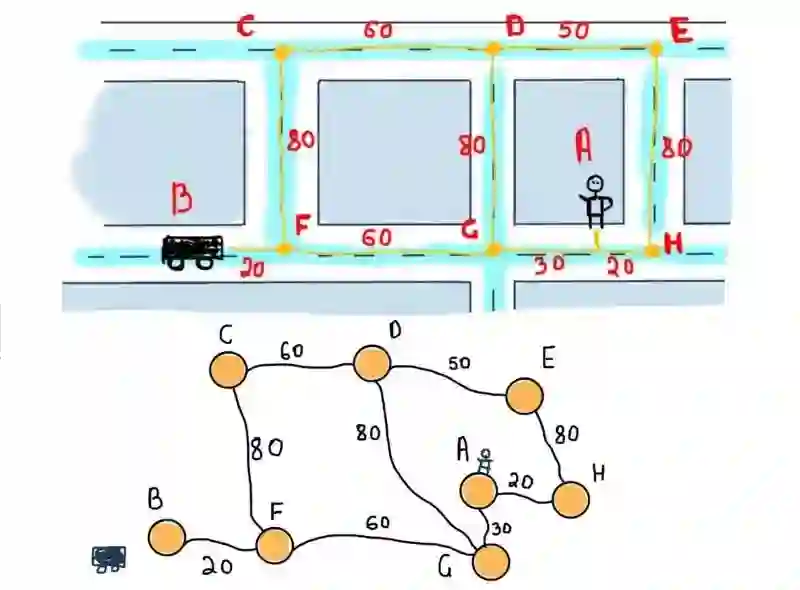 车辆到乘客的可能路线用黄色标出。那么现在的问题是计算从车辆到乘客需要的最小距离,也就是说,要找到最短路线。虽然这个问题更像Google地图而不是Uber应该考虑的,但我们还是要解决这个简化的问题,因为通常乘客附近有多辆车,Uber需要计算距离最近且评分最高车辆发送给乘客。