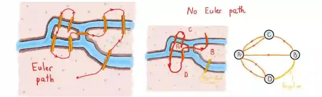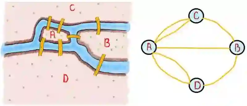 你可以尝试一下,用每座桥只通过一次的方式来走遍整个城市。“每座桥”意味着不应该有没有通过的桥。“只有一次”意味着不得多次通过每座桥。如果你对这个问题很熟悉,你会知道无论怎么努力尝试这都是不可能的;再努力最终你还是会放弃。