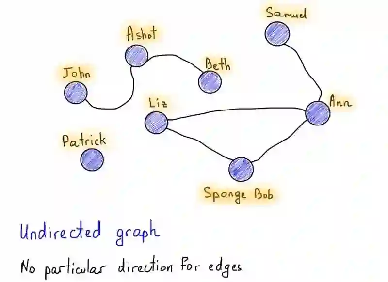 还要注意标记为“Patrick”的节点,它有点特别,因为没有任何连接的边。但“Patrick”点仍然是图的一部分,但在这种情况下,我们会说这个图是不连通的,它是非连通图(与“John”,“Ashot”和“Beth”相同,因为它们与图的其他部分分开)。在连通图中没有不可达的节点,每对节点之间必须有一条路径。