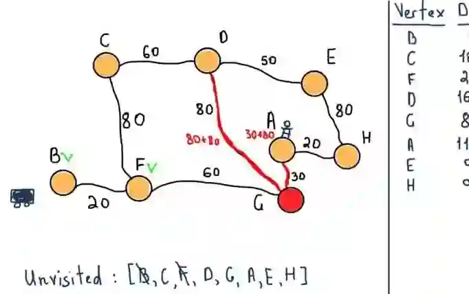 现在将F标记为已访问,并选择具有最小暂定距离的点为下一个未访问节点,即G。依然需要注意左侧的表格,在前面的图例中,节点C,F和G已经将它们的暂定距离设置为通过之前所提到的结点的距离。
