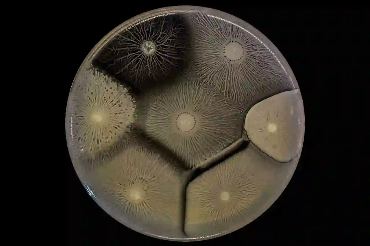 在这个培养皿中,几种不同的枯草芽孢杆菌菌株并列生长。生物膜可以区分不同的细菌菌株,它们可以与近亲相融合,但与其他菌株形成边界。