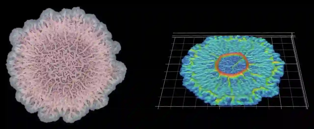这种枯草芽孢杆菌生物膜的褶皱结构有助于确保其中的所有细菌的氧气供给(左)。 生物膜的三维数字扫描模型有助于说明细菌群落如何改变其结构(右)。