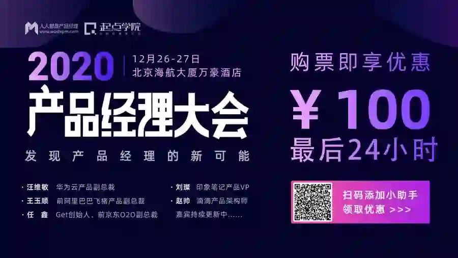 2020年全国产品经理大会巡回还剩下最后一站:北京(12月26-27日)已开启预售,添加大会小秘书微信:13242068821,获取大会门票优惠福利及大会PPT资料哦!