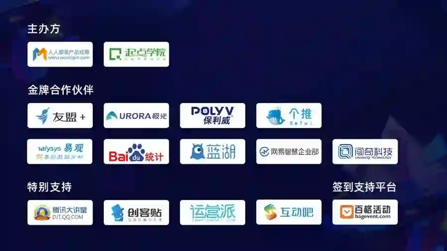非常感谢合作伙伴友盟、极光、保利威、个推、易观、百度统计、蓝湖、网易智慧企业部、闯奇科技对本次大会的支持: