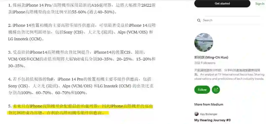 “未来只有 iPhone 高阶机型会配备最新的处理器,因此 iPhone 高阶机型的高出货比例将成为常态,有利于高阶相机零组件供应商。”