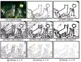 VGG-16作为backbone。在VGG-16的5个block的Max Pooling降采样之前,HED通过side_branch函数产生了5个分支,最后这5个side_branch的输出通过Concatenate操作合并在一起。网络的5个side_branch和一个fuse branch通过sigmoid激活函数后共同作为网络的输出,每个输出的尺寸均和输入图像相同。