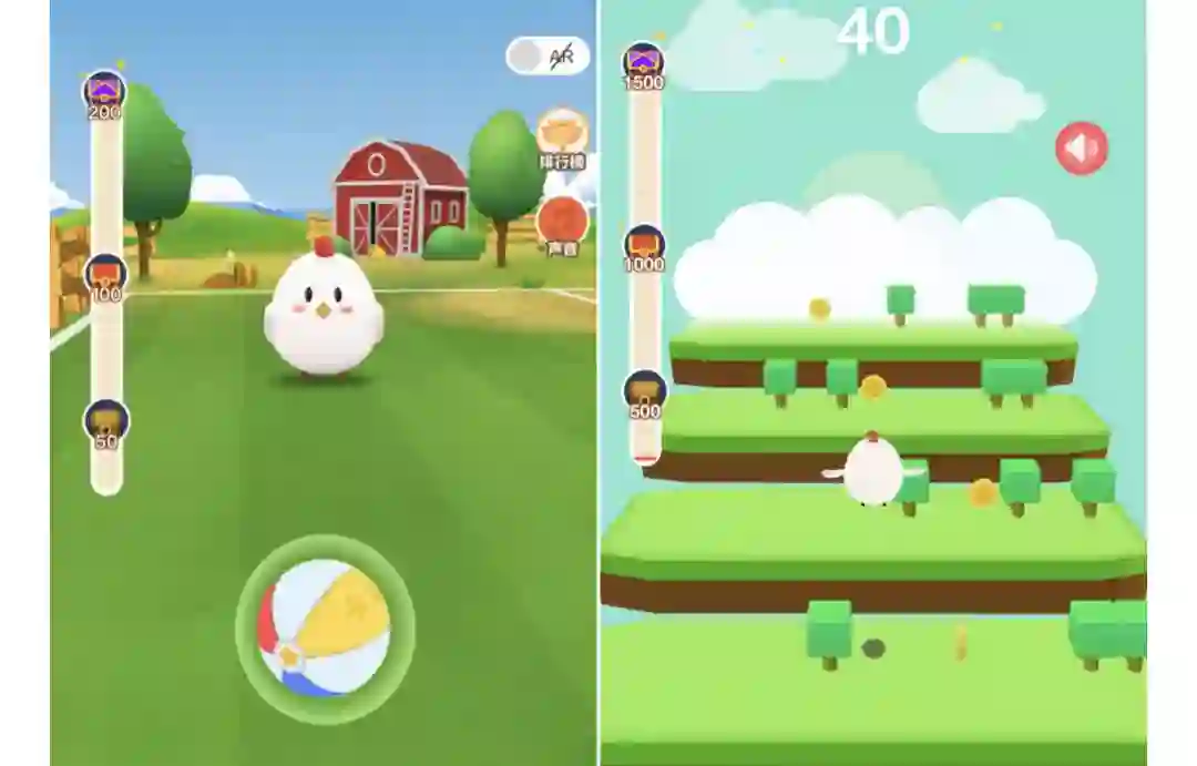 以蚂蚁森林和蚂蚁庄园为例:二者会同时共用一些能量生成方式(毕竟可记录的用户有效行为是有限的),且可以在彼此之间快速切换。同时,蚂蚁庄园也开发了运动会模块,目前包含“星星球”和“登山赛”两个小游戏,都是以小鸡为主角的游戏。