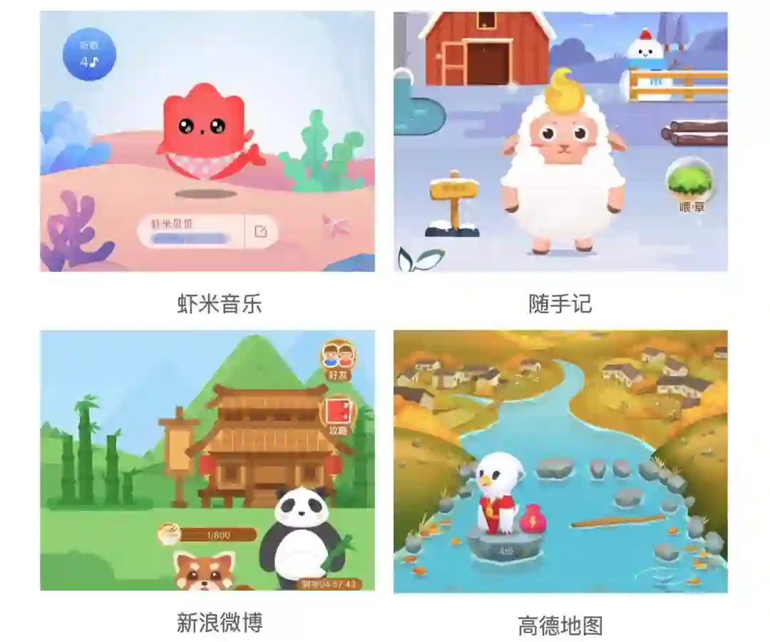目前已有虾米音乐的“养虾米”、高德地图的“高德小桥”(卡通形象为小鹰)、新浪微博的“熊猫守护者”、随手记的“随手薅羊毛”、淘宝的“野生小伙伴”、优酷视频的“果园大作战”等玩法把大量人民群众喜闻乐见的动物、植物据为己有。