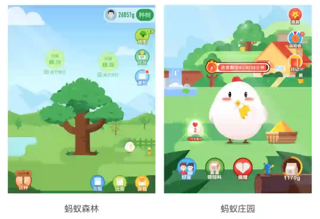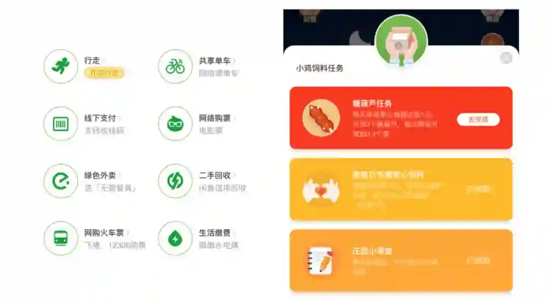 蚂蚁庄园:用户通过做任务获得饲料,然后喂食小鸡产生爱心,爱心达到一定数量后可以进行公益捐赠。