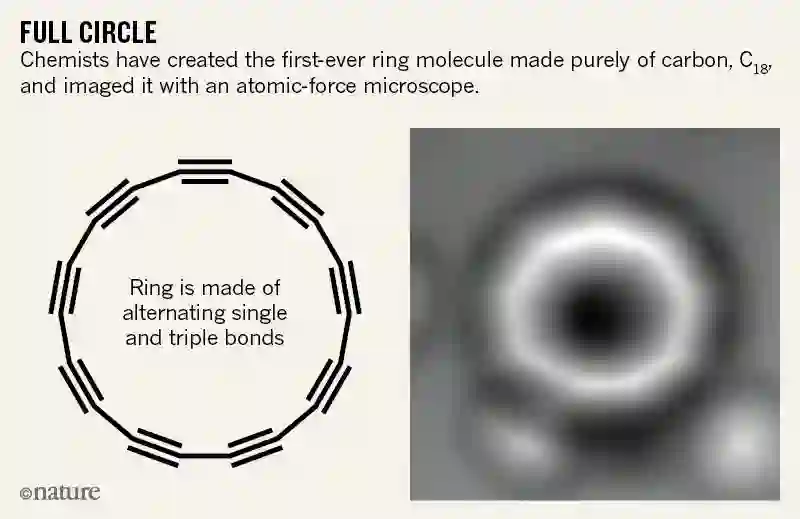 8 月 15 日,Sicence 发表了牛津大学化学系与 IBM 苏黎世研究实验室合作的一项成果,他们合成了世界上第一个完全由碳原子构成的环状分子—— C18 ,其中的 18 个碳原子通过交替的单键和叁键连接而成,早期研究发现 C18 环分子具有半导体特性,这意味着类似的碳直链结构可能可以成为分子级别的电子元件。