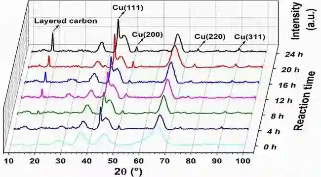 研究人员使用XRD、TEM等手段揭示了CuAlOx表面氮掺杂碳膜形成的条件与过程,发现以1,10-菲啰啉为前驱体,氢气气氛下可以实现碳膜的可控构筑。以XRD表征不同制备时间的催化材料发现,随着反应时间的延长,层状碳配体的衍射峰越来越强。而TEM表征则说明,层状碳配体首先在催化材料的边缘开始生成然后逐渐覆盖催化材料的表面。