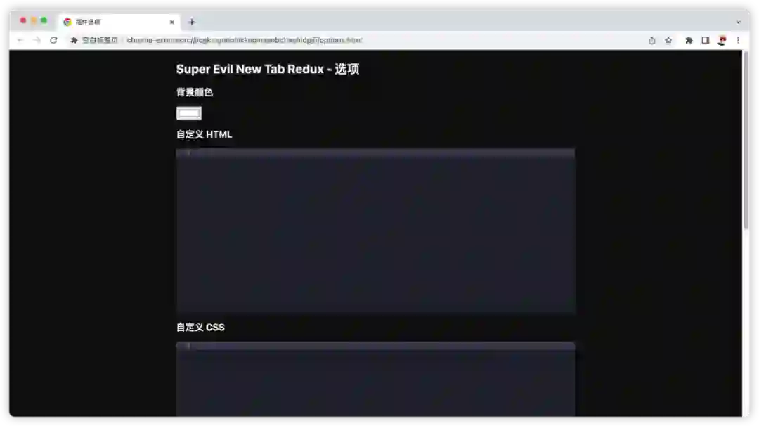 在上文中我们利用 Super Evil New Tab Redux 获得了全空白的 newtab,但其实 Super Evil New Tab Redux 拥有丰富的自定义功能。除了改变背景颜色,你还可以可以通过编辑 HTML、CSS、JS 代码,定制属于自己的 newtab。