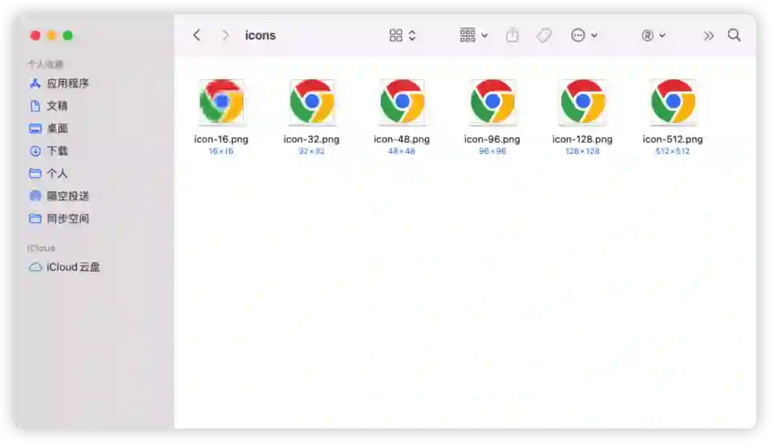 选择一个你喜欢的图标,分别下载尺寸为 512、128、96、48、32、16 的 png 文件。打开插件源码中的「icons」文件夹,按照其中的文件命名规律,对刚刚下载的图标文件重新命名,替换原文件。