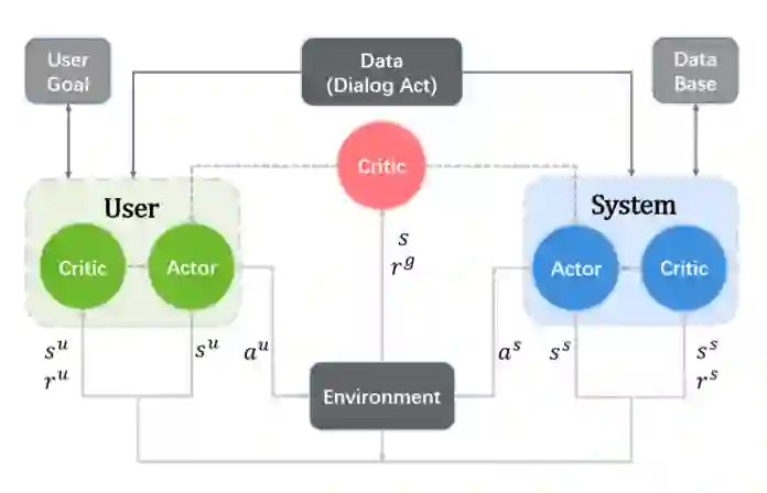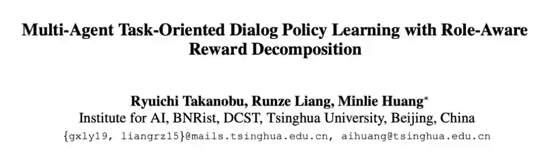 为了避免事先明确地构建用户模拟器,清华大学黄民烈团队(CoAI课题组)在发表于ACL 2020 上的长文《Multi-Agent Task-Oriented Dialog Policy Learning with Role-Aware Reward Decomposition》中提出了多智能体对话策略学习法,该系统将系统和用户都视为对话代理。