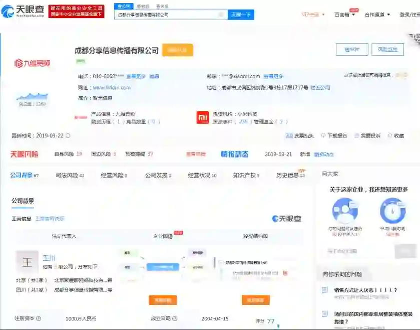 在天眼查上查询显示,“朕惊视频”运营主体成都分享信息有限公司,成立于2004年,注册资本为1000万元,法定代表人是小米科技联合创始人、小米集团中国区总裁王川,实际控股股东为小米科技有限责任公司。