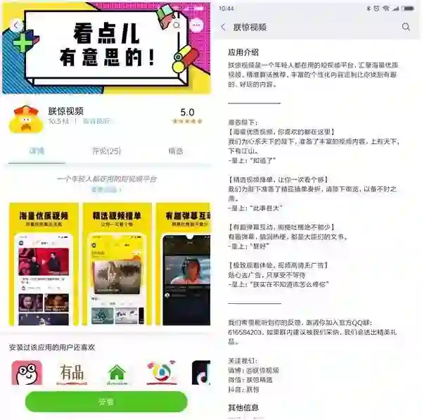 看来“朕惊视频”是小米家的没错了。据介绍,朕惊视频是一个专为年轻人打造的短视频平台,汇聚海量优质视频,精准算法推荐,丰富的个性化内容定制让你找到有趣、好玩的内容。