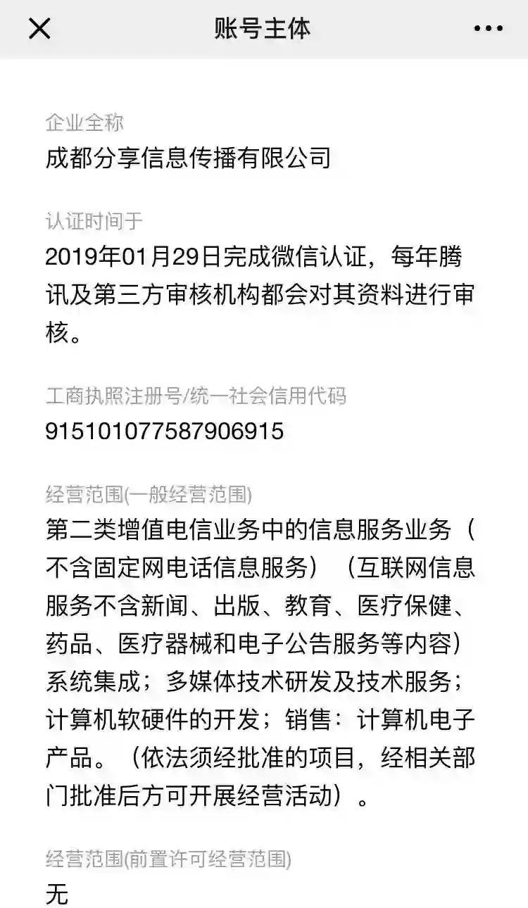 “朕惊视频”目前只在小米应用商店和百度手机助手中出现。从其官方公众号“朕惊精选”的介绍来看,其运营主体为成都分享信息有限公司。