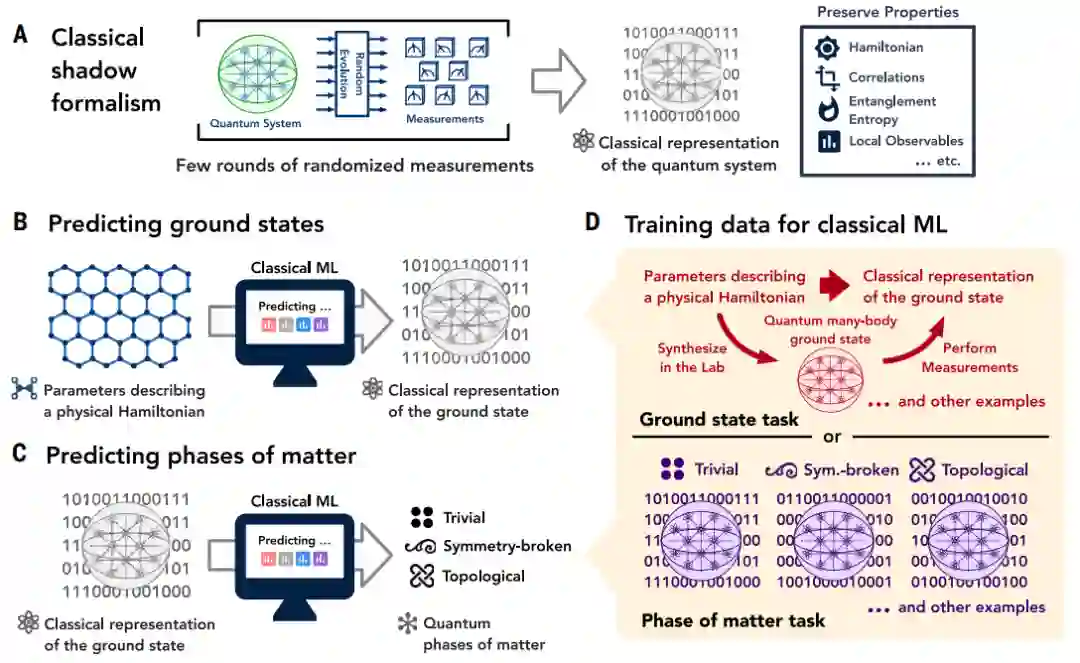 研究人员已经严格确定,经典的机器学习算法,根据物理实验中收集的数据,可以有效地解决一些量子多体问题。这些严谨的结果提高了科学家的希望,即在实验数据上训练的经典 ML 可以解决化学和材料科学中的实际问题,这些问题仅使用经典处理很难解决。该团队的论点建立在从随机泡利测量得出的量子态的简洁经典表示的概念之上。尽管一些量子设备缺乏执行此类测量所需的局部控制,但他们希望经典 ML 可以利用其他经典表示并获得类似的强大结果。如何利用可访问的测量数据来可靠地预测属性?回答这些问题将扩大近期量子平台的范围。