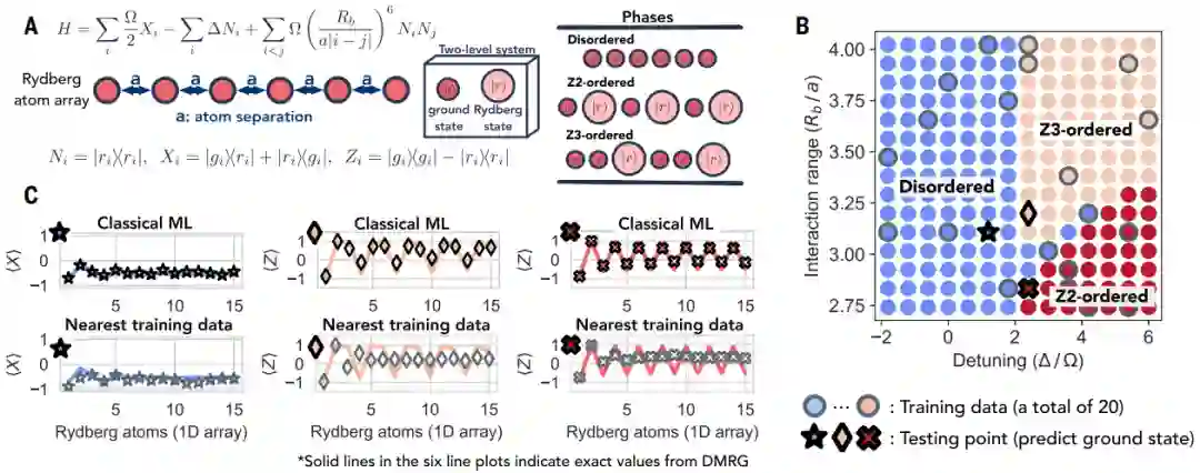 该团队还证明了经典的 ML 算法可以有效地对各种量子相进行分类。大量的数值实验证实了他们在各种场景中的理论结果,包括里德堡原子系统、二维随机海森堡模型、对称保护拓扑相和拓扑有序相。