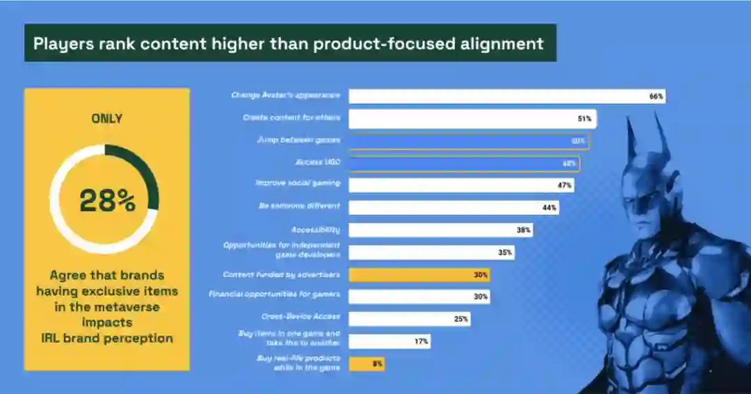 只有28%的玩家称,在元宇宙中拥有商品的品牌将改变他们在现实生活中的看法