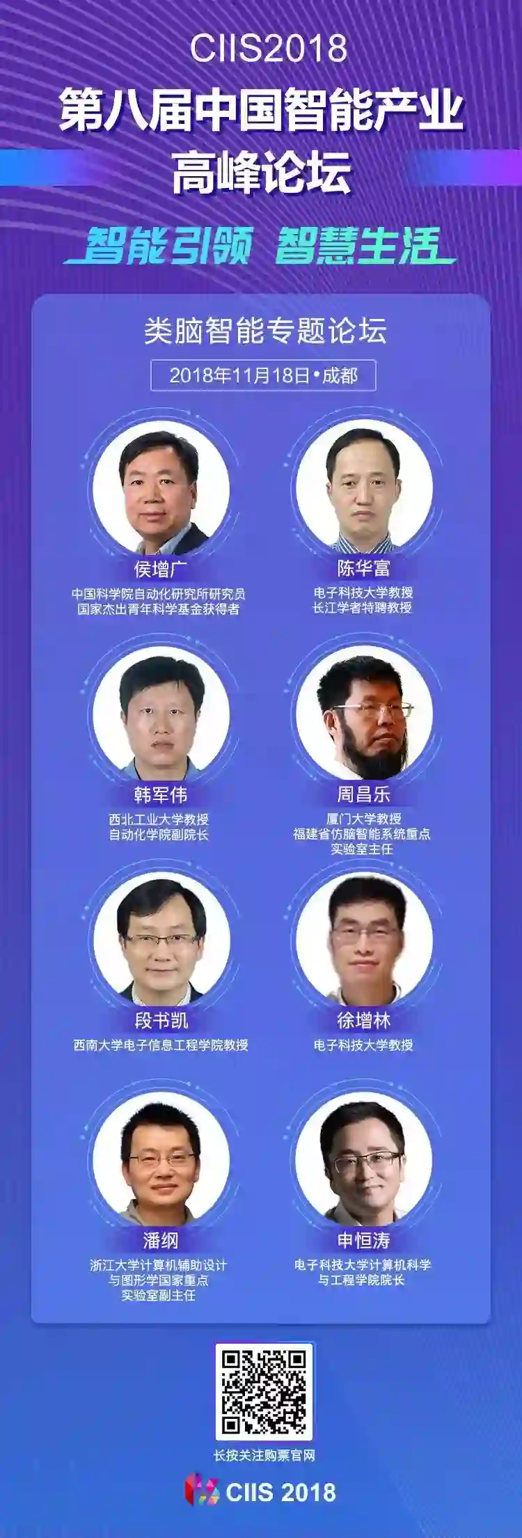 2018年11月17日~18日,CIIS2018(第八届中国智能产业高峰论坛)将在成都召开,“类脑智能专题论坛”由浙江大学计算机辅助设计与图形学国家重点实验室副主任潘纲教授和电子科技大学计算机科学与工程学院院长申恒涛教授担任主席,届时在大会上将有6位资深专家为大家带来一场学术与技术盛宴,他们分别是: