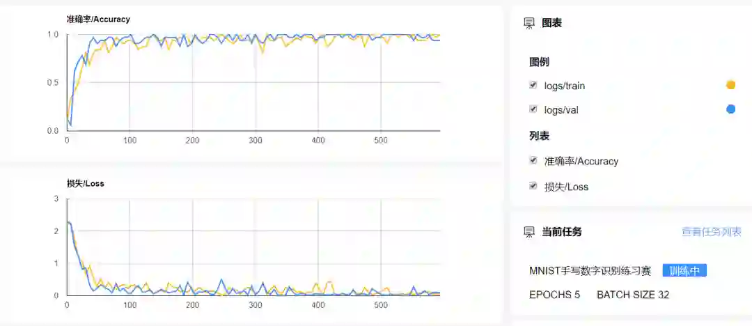 通过调用FlyAI提供的train_log方法可以在训练过程中实时的看到训练集和验证集的准确率及损失变化曲线。