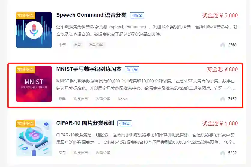 在 FlyAI竞赛平台上 提供了准确率为99.26%的超详细代码实现,同时我们可以通过参加MNIST手写数字识别练习赛进行进一步学习和优化。