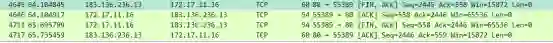 图中显示的就是完整的TCP连接释放的”四次挥手”过程。在 80 -> 55389 中,假设80是本地(客户端)端口,55389是服务器端口。80端口与55389之间的四次来回就是"四次挥手"过程。