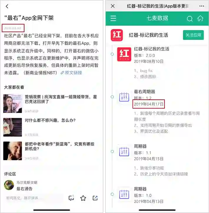 果然,查了一下它的版本更迭记录,这个 App 原本叫周期器,在今年 4 月份改为“最右周期器”,而这个时间刚好是最右被全网下架的时间。
