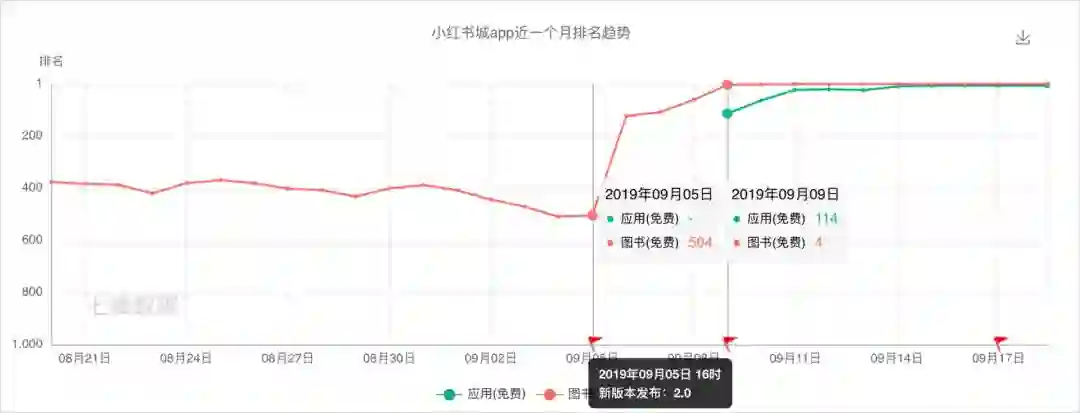 纵观「小红书城」近一个月的排行(iPhone App Store),早期一直是图书免费榜 400 名左右,新版本 2.0 发布之后,在短短 10 天内,升到了图书免费榜第一,应用免费榜前十。