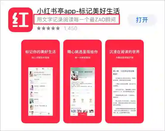 比如「小红书城」的主标题是“小红书城app-文字记录美好瞬间”,副标题是“生活需要分享,更需要阅读”。