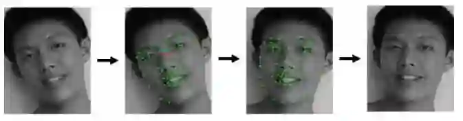 人脸校准也是,给机器的头不管是歪头、低头还是仰着头——位置都不正,那就先将脸边框截出来,为每个点进行定位(如下图中的绿点),再根据点定位出一个坐标,跟真正摆正的脸的坐标进行对比,二者相差的角度,就是头歪的角度,将图像反向旋转一下,图像就变正了。
