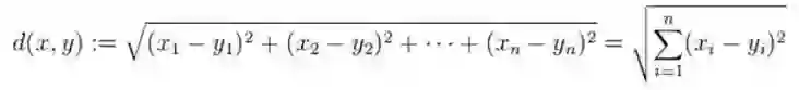 然后是目标函数。卷积神经网络中最多的回归问题,用的都是欧式(Euclidean)距离,算法为:。我们一般采用最右边的公式,该公式为求和公式,从 1 开始取到 n,对两个数之间的差值进行计算。
